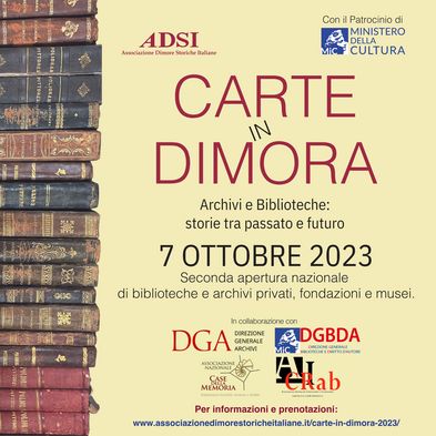 Sabato 7 ottobre l’Associazione Dimore Storiche Italiane inaugura la seconda edizione della manifestazione nazionale “Carte in dimora. Archivi e Biblioteche: storie tra passato e futuro”, che affiancherà l’iniziativa “Domenica di carta”, promossa dal Ministero della Cultura, che da diversi anni organizza l’apertura di Biblioteche pubbliche ed Archivi di Stato, prevista quest’anno per domenica 8 ottobre.