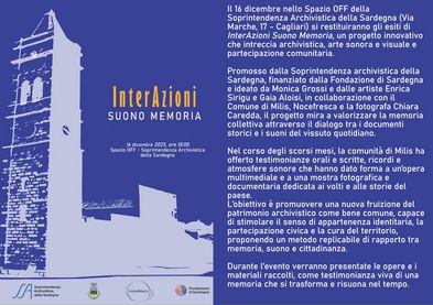 Vi aspettiamo martedì 16 dicembre alle 18.00 nello Spazio OFF della Soprintendenza archivistica della Sardegna (Cagliari, via Marche 17) per presentarvi gli esiti di InterAzioni Suono Memoria, un progetto innovativo che intreccia archivistica, arte sonora e visuale e partecipazione comunitaria.