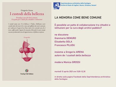 L’iniziativa prenderà avvio il prossimo 13 aprile, dalle ore 11,00 alle 12.30, con l’incontro con Gregorio Arena, presidente di LABSUS e autore del libro I Custodi della bellezza. Prendersi cura dei beni comuni. Un patto per l'Italia fra cittadini e istituzioni (2020). L’incontro sarà trasmesso in diretta sulla pagina Facebook della Soprintendenza archivistica all'indirizzo https://www.facebook.com/soprintendenzaarchivisticasardegna